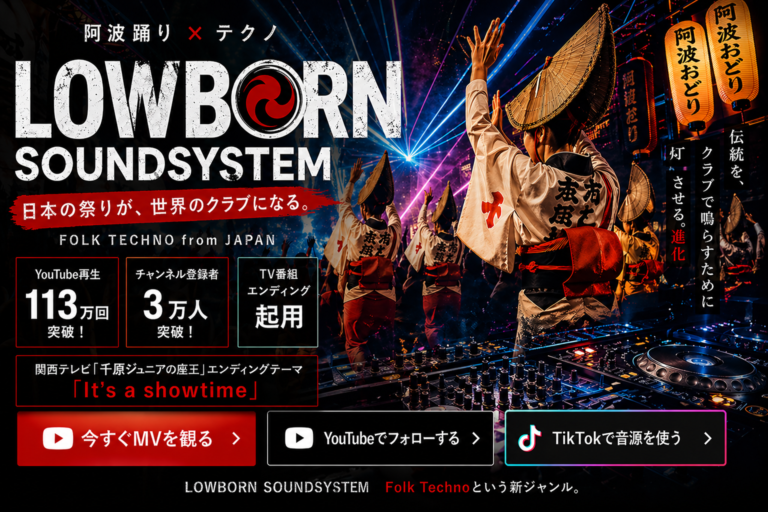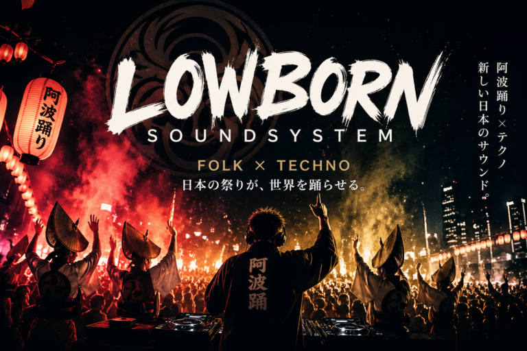 LOWBORN SOUNDSYSTEMとは? 阿波踊り、民謡、テクノ、エレクトロを融合させる日本発のFolk Technoプロジェクト。 阿波踊りテクノのMVを見る 基本情報 名称 LOWBORN SOUNDSYSTEM 読み方 ローボーンサウンドシステム ジャンル Folk Techno / テクノ / エレクトロ / 和風クラブミュージック 代表曲 阿波踊りテクノ 特徴 日本の祭り・民謡のリズ […]